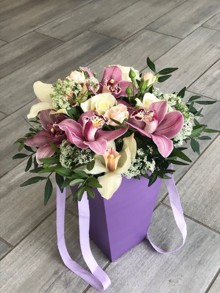 Cutie cu flori naturale. Flori folosite:orhidee cymbidium, trandafiri, minirose, lisianthus,ranunculus.
