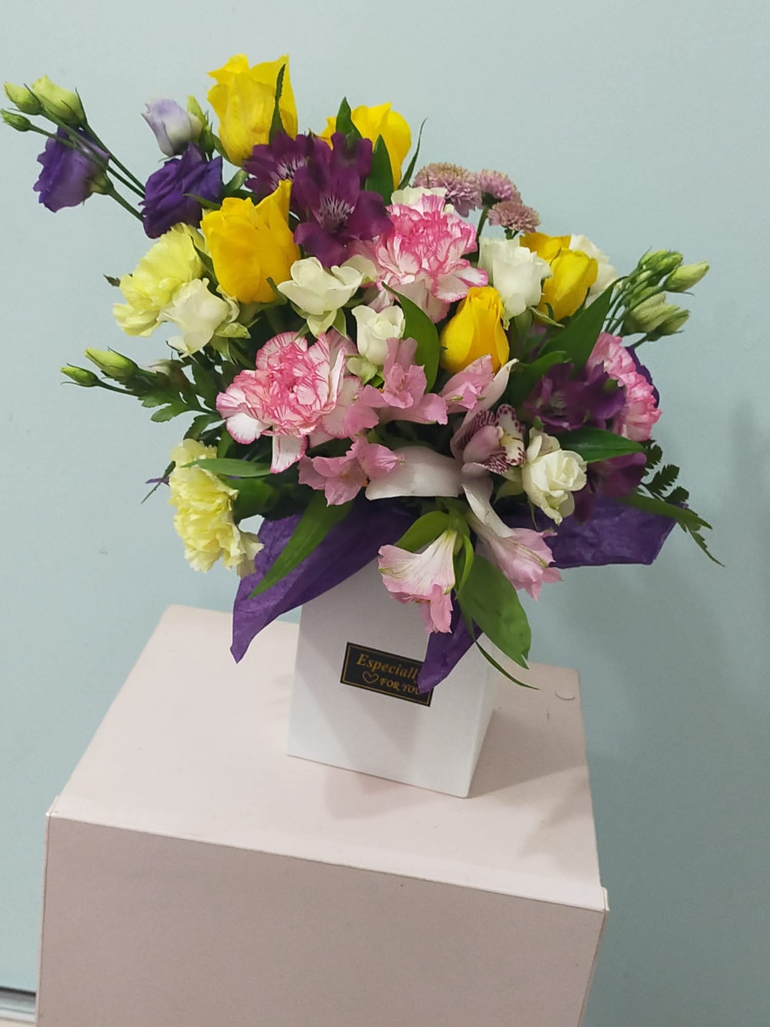 Cutie plic realizata cu flori naturale. are in componenta iris, minigerbera, minirose, lisianthus, alstromelia.